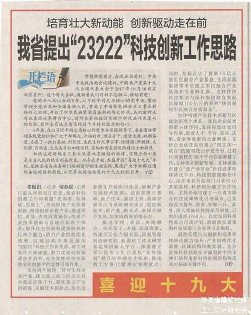 編者按:9月2日《陜西日報》頭版開辟“喜迎十九大”專欄,反映全省各地各部門砥礪前行的生動實踐,展現(xiàn)廣大干部群眾團結奮進的嶄新面貌,以優(yōu)異成績迎接黨的十九大勝利召開。開篇刊發(fā)《培育壯大新動能 創(chuàng)新驅(qū)動走在前 我省提出“23222”科技創(chuàng)新工作思路》文章,請閱讀!