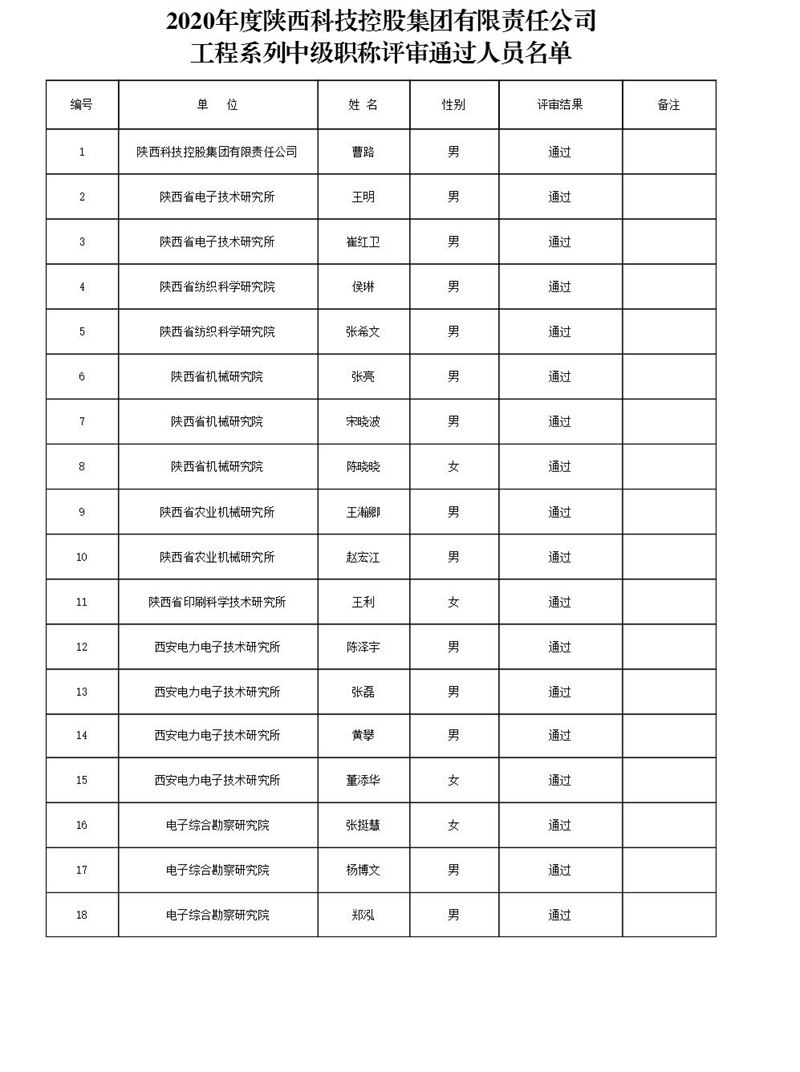 經(jīng)2020年度陜西科技控股集團(tuán)有限責(zé)任公司工程系列中級職稱評委會評審,共18名同志通過評審,現(xiàn)予以公示。