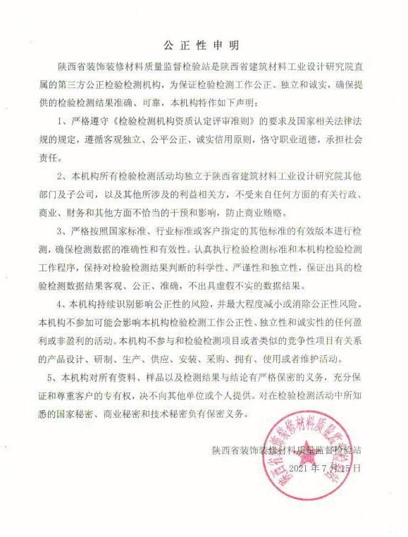 陜西省裝飾裝修材料質(zhì)量監(jiān)督檢驗站公正性申明