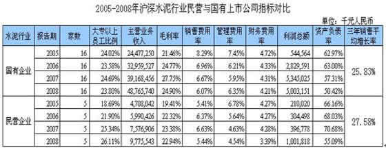 英策咨詢2009版《中國上市公司數(shù)據(jù)庫》顯示,在2005年至2008年這4年間,我國滬深交易所共有21家水泥行業(yè)的上市公司,其中,國有控股上市公司16家,占76%;民營控股上市公司5家,占24%。我們根據(jù)上述《中國上市公司數(shù)據(jù)庫》,編制了以下這張“2005-2008年滬深水泥行業(yè)民營與國有上市公司經(jīng)營指標(biāo)對比表”。