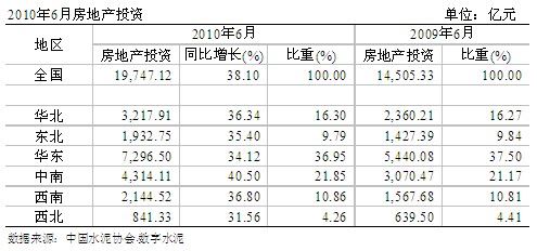 2010年1~6月份,房地產(chǎn)投資繼續(xù)保持穩(wěn)定,同比增長(zhǎng)38.1%,與1~5月同比增速基本相當(dāng),其中中南地區(qū)增速最快,同比增長(zhǎng)40.50%,華北增速有所放緩。地區(qū)中,海南、廣西、福建、河北增長(zhǎng)超過(guò)50%。
