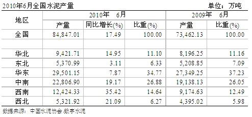 2010年1~6月份,水泥產(chǎn)量84,847萬(wàn)噸,同比增長(zhǎng)17.49%,主要受雨季提前影響,六大產(chǎn)區(qū)產(chǎn)量增速都有所放緩。地區(qū)中,海南、四川、湖北增速都超過(guò)40%,仍位居前列。